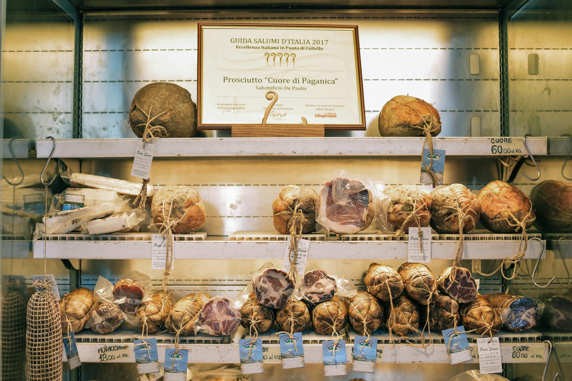A picturesque, tiny village just 90 minutes' drive northeast of Rome, Paganica sits outside the small town of Aquila. While it is well known for its saffron production, Mr De Paulis was our stop in his delicatessen and salumeria. His family have been making prosciutto for four generations, meaning that his salumi ranks amongst the very best in Italy. Just 150 legs of prosciutto are produced every year because they craft the pork in ancient, time-consuming methods. They season the legs and then let them dry in the pristine mountain air of Gran Sasso, a beautiful and wild region that is typical of rural Italy: stunning landscapes, honest, hard-working people - and incredible produce.